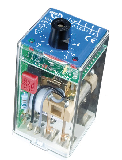 Plug-in industrial electronic timer relay with four change-over contacts. When the relay is activated there is a delay on pull-in. The delay time is adjustable with a lockable knob.The relay can also be supplied with a fixed time delay (no knob). The relay is standard equipped with two LEDs which indicate the presence of power supply and the energizing of the coil. Optionally equipped with magnetic arc blow-out for high breaking capacity and long contact life.